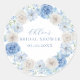 Adesivos de chá de bebê elegantes apresentam uma guirlanda floral em aquarela com flores lindas em tons variados de azul, bem como uma escrita em caligrafia delicada.