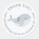 Baleia branca e empoeirada, desenhada à mão, com estrelas, chá de fraldas de cola redonda. Blue round sob o adesivo da festa do bebê do mar com o exemplo de texto "Obrigado por nos chutar com oceanos de amor" em um fundo azul pastel listrado. Explore modelos de design inspiração marinha para bebês e crianças com criaturas agudas do mar, decoração de berçários costeiros e ideias de presentes para recém-nascidos feitos com amor oceânico e uma suave brisa do mar © y.BEE SEA #zazzlemade #roundsticker #babyshower
