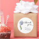 Tema moderno e boho chá de fraldas favorece adesivo com ilustração aquosa do balão azul com folhas botânicas verdes. O texto diz "obrigado você".