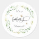 Um design de adesivo redondo com a frase É um Chá Babee com pequenas abelhas, cercado por uma delicada coroa em tons de verde macio. Coordena-se lindamente com nossos convites para chuveiros de bebês e muito mais.