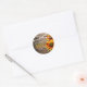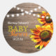 Adesivo de chá de fraldas de girassol, com fundo de madeira rústico, dois girassóis amarelos e laranja, luzes cordas e um modelo fácil de personalizar.