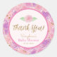 Diga "Obrigado!" com esses chás de fraldas personalizados. Estes adesivos são personalizáveis: Você pode editar o texto clicando em "personalizar este modelo". Decorre as suas bolsas de goodada ou favores de chá de fraldas com este obrigado giro-doce à volta do chique que você cola com uma mão pintada com um padrão rosa de cor d'água com falso confete de brilho dourado. Estes adesivos redondos são excelentes para personalizar todo o tipo de favoritos para festas para as raparigas!