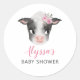 Convite para chás de fraldas do tema da fazenda rustica com ilustração aquosa de uma vaca bebê com flores cor-de-rosa.