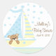 Um adesivo de Chá de fraldas bonito com um Urso Doce navegando em um veleiro azul e amarelo. Vinheta perfeita para favores de bebês ou selos de envelope de convite! Os convites correspondentes, selos postais e notas de agradecimento estão disponíveis no nosso compro em www.celebrateitinvites.com. ©Cocoa Studio