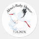 Caça de cartoons voando com um bebê em um cobertor em um fundo branco para um Chá de fraldas. O texto é editável. A cor de fundo pode ser alterada.
