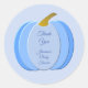 Esta maravilhosa folha de Chás de fraldas apresenta uma imagem de arte digital de uma abóbora azul fofa com 3 tons diferentes de azul ficando mais escuro em direção às bordas da abóbora. Há um pé verde anexado ao topo. Um design perfeito para celebrar um bebê, especialmente no Dia de Ação de Graças. Uma maneira fofa de revelar o gênero do bebê. Há texto personalizado para que você possa personalizar este design com uma mensagem para seus convidados.