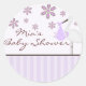 Este adesivo de Chá de fraldas personalizável moderno apresenta uma menina, pássaro e flores roxas em um fundo listrado roxo e branco. Personalize-o adicionando seus detalhes na fonte de sua escolha!