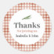 Adicione um toque divertido e ponderado aos seus favores com este Chá de fraldas Russo Obrigado Clássico Round Sticker! Apresentando um fundo de pêssego e xadrez de terracota e uma tipografia ousada e moderna, essas etiquetas são perfeitas para agradecer aos convidados no seu churrasco de chá de fraldas. Com um design neutro em termos de gênero e charme quente e rústico, eles são ideais para qualquer casal, independentemente do sexo do bebê, e perfeitos para uma celebração de chá de fraldas de verão. Parte da nossa coleção de Chás de fraldas Baby-Q. Use o botão azul "Personalizar" para personalizar com sua mensagem ou nomes. Ideal para amarrar bolsas, potes ou favoritos para festas! Design do Ana Garza/Kardz Studio. Se tiver alguma pergunta, por favor contacte-me através do bate-papo Zazzle.