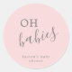 gêmeas quentes e modernas gêmeas chás de fraldas favorecem adesivos com um design mínimo com a mensagem "Oh Babies" em fontes serif e de escrita manual e seu nome e título de evento abaixo, em cinzas, sobre um fundo rosa pastel. As fontes e as cores de fundo podem ser alteradas para qualquer cor desejada clicando no botão "personalizar". Estes adesivos elegantes são perfeitos para um chá de fraldas para meninas gêmeas e adicionam um toque pessoal aos seus favores.