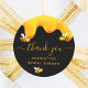 Um fundo preto chic decorado com mel pingando dourado. O texto: obrigado com um estilo de letra manuscrita dourada com floreios. Personalize e adicione um nome e texto. Para lembranças de festa de chá de noiva.