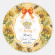 Um design elegante de Chá de Noiva com abelhas e fundo de girassóis e um laço coquete laranja.