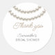 Adesivo Redondo Clássico Chá de Noiva Elegante Branco com um colar de pérolas prateadas em aquarela. É muito fácil de personalizar, com detalhes dos seus dados pessoais.