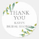 Meadow novo deixa chá de panela, obrigado seu adesivo redondo clássico. Projetado para coordenar com a nossa coleção de casamentos botânicos das folhas frescas. Apresentando uma delicada folhagem verde de aquarela, moldando seus detalhes de chá de panela em letras elegantes. Projetado por Thisnotme©