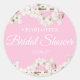 Um adesivo branco elegante e bonito, redondo, com cola redonda, com delicada cor de primavera, enquadra os detalhes do seu chá de panela em uma letra branca elegante num fundo cor-de-rosa rosa. Personalize com seus detalhes de eventos especiais. Perfeito como selos de envelopes ou adesivos de favor para os seus convidados. Projetado por Thisnotme©