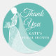 Chá de panela elegante de vestimenta branca e turquesa, obrigado seu adesivo redondo clássico com noiva vestindo um vestido elegante de casamento de rendas em um fundo de turquesa com um belo texto branco de roteiro para seus detalhes especiais de chá de panela. Você pode personalizar a cor de fundo para coordenar com seu tema de casamento.