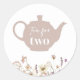 Um bule de chá rosa com dentro de tipografia 'chá para dois', juntamente com uma delicada aquarela pintada de flores silvestres ao longo do fundo. Perfeito para sua festa de chá de segundo aniversário!