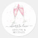 Os adesivos festivos e elegantes para a sua festa de noivado, janto de ensaio ou casamento contêm um par de copos de champanhe em água, cheios de espuma rosa. Personalize com duas linhas de texto personalizado abaixo; mostradas com "torcida para amar" e os nomes dos casais.