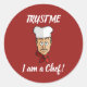 Cabeça de chef com chapéu, corcunda vermelha e texto personalizado.