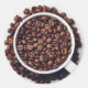 Cheio de xícara branca de grãos torrados de café em um pires sobre a superfície de madeira. Ver a partir de cima