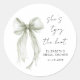 Adesivos Chic para convites de chá de noiva, cartões de agradecimento e lembrancinhas que apresentam uma aquarela elegante de um laço coquete verde sage claro, "Ela está dando o nó" em uma fonte moderna, e o nome da noiva e a data do chá em letras simples.