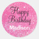 Tchic personalizado e grito Feliz Aniversário clássico, vinheta redonda, com um fundo brilhante rosa quente e um escrevendo preto e branco. Você pode adicionar facilmente o nome de sua escolha e alterar a cor e a fonte do nome usando a opção personalizar!