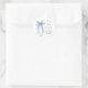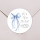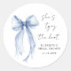 Adesivos elegantes para convites de chá de noiva, lembranças e cartões de agradecimento com uma pintura em aquarela de um laço azul coquete, "Ela está dando o nó" em uma fonte moderna e o nome da noiva e a data do chá em letras simples.