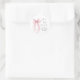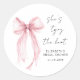 Adesivos Chic para convites de chá de noiva, lembranças e cartões de agradecimento com uma aquarela elegante de um laço coquete rosa claro, "Ela está dando o nó" em uma fonte de caligrafia moderna e o nome da noiva e a data do chá em letras simples.