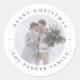 Estes adesivos elegantes e rústicos de Natal mostram sua foto pessoal com um simples fundo branco e texto clássico de cinza escura que diz "Feliz Natal", mas você pode mudá-lo para qualquer saudação que você preferir. O mínimo perfeito para seus cartões de natal e presentes!