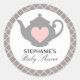 Um belo design de chá chá de fraldas em cinzas quentes, rosa e branco faz ótimos adesivos de favores para uma Festa de Chá Chá de fraldas. Enquanto que, elegante, a silhueta de um bule enfeitado com um coração cor-de-rosa faz deste adesivo um belo lembrete da maravilhosa festa de chá realizada para a futura mãe.