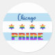 Este design de Chicago PRIDE combina os elementos da bandeira de Chicago com as cores do arco-íris LBTQ. A palavra Chicago está em uma fonte de tipo de script azul. As quatro estrelas e a palavra "PRIDE" estão nas cores do arco-íris.