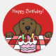 Cartoon exclusivo e engraçado Labrador Retriever criado por Naomi Ochiai do Japão. Design de Festa de aniversário de Cartoon Labrador de Chocolate para amantes de cachorros que adoram Chocolate Labrador Retriever. Um adesivo de aniversário de cartoon de cachorro muito bonito com um laboratório de chocolate e um Bolo de aniversário na mesa. Você pode personalizar texto e muito mais!