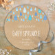 Gotas de chuva azul chic caem em direção aos seus detalhes personalizados em um fundo kraft rústico, neste adesivo de baby sprinkle fofo. Ideal para selar envelopes de convites ou lembrancinhas. Criado por Thisisnotme©