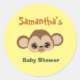 Ótimas figurinhas para o seu chá de bebê, este design apresenta um rosto de macaco marrom no centro com o nome da convidada de honra acima escrito em marrom, e "chuva de bebê" escrito abaixo em fonte verde. Personalize o seu hoje mesmo!