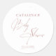 Este design foi criado para uma chuva de bebê moderna com um visual suave e elegante. O script rosa bege fluído, detalhes delicados de speckles e espaço branco limpo o tornam atemporal e luxuoso. Perfeito para selar envelopes, sacolas de lembranças ou adicionar um toque final elegante à sua celebração.