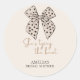Este adesivo de chuva de noiva com laço bege terracota minimalista apresenta laço bege com fundo creme bege e um texto que diz que ela está dando o nó.Ambiente perfeito para o tema de chuva de noiva com laço para o seu grande dia.