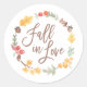 Adesivos modernos para chuva de noiva de outono apresentando nossa exclusiva coroa pintada à mão em aquarela com tema outonal. O texto diz "Apaixone-se" em tipografia de pincel chic com letras à mão. Use como selos de envelope, adesivos de favor, etc...