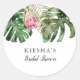 Adesivo de favor moderno para o seu chá de noiva com tema tropical apresentando ilustração de aquarela de folhas de monstera, folha de palmeira e flor de protea rosa.
