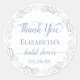 Esses adesivos lindos são perfeitos para agradecer os convidados em um chá de noiva. O design apresenta um texto de caligrafia em cor azul desbotado ou pervinca fancy em um fundo branco clássico com uma borda de renda floral em prata cinza com efeito de folha de alumínio. O texto diz Obrigado, com espaço para o nome da noiva e a data.
