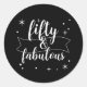 Celebre os cinquenta anos com estilo com este design de tipografia preta e branca Fifty and Fabulous - perfeito para lembranças de festa de 50 anos ou selos de envelope para uma celebração moderna de um marco.