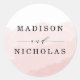 Simples e elegante adesivos de casamento com uma lavagem de cor-de-água cor-de-rosa pincelada com espaços reservados para personalizar com seus nomes. Os adesivos de casamento personalizados são perfeitos para serem usados como selos de envelope de casamento ou favoritos para festas.