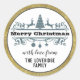 Quic e elegante feriado clássico de Natal feliz com um adesivo redondo dourado brilhante borda e fundo branco. As palavras "Feliz Natal" são escritas num roteiro negro e ousado. O adesivo é decorado com uma design de cinza suave, rico, com uma árvore de Natal, duas renas e bolhas. Na parte inferior do adesivo estão as palavras "com amor de" na cinza, e o sobrenome da sua família em preto.