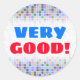 Este design de adesivo apresenta um padrão abstrato de quadrados ou azulejos coloridos de cores como cinza, roxo, bege e e azul. Também apresenta o encorajador ditado "MUITO BOM!" em texto azul e vermelho. Os adesivos como estes poderiam talvez ser usados por professores, educadores ou tutores para reconhecer e motivar um estudante que fez um trabalho muito bom em um teste, teste, papel, projeto ou outra tarefa escolar ou acadêmica. [~Z0000118]