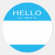 O adesivo circular com o texto tradicional "Olá, meu nome é" em azul. Escreva em nomes no adesivo de acabamento.