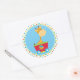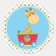 Este adesivo com tema circo apresenta um fundo azul rodeado por um padrão repetitivo de estrelas vermelhas, azuis, amarelas e verdes. Um carro de trem vermelho carregando uma girafa bonita fica no meio do adesivo. Esta design faz parte da minha coleção "Circus Themed Festa de aniversário". Clip-art por Prettygrafik design etsy.com/shop/Prettygrafikdesign