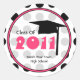 Um adesivo de graduação com fundo de bolinhas pretas. O texto ao lado do círculo cor-de-rosa dentro boné de formatura preto diz "Classe de 2011." Personalize com seu nome ou nome escolar.