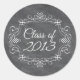 Este adesivo de graduação redonda tem um design de quadro de chalkboard tradicional. Há uma estrutura giratória em torno do texto cursivo, "Classe de 2013". Isso é perfeito para selar os envelopes para seus anúncios/convites de festas de graduação que você envia.