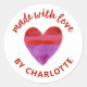 Um adesivo personalizado "Feito com amor" com um coração pintado de vermelho e roxo em um fundo branco. Torne-o seu adicionando seu próprio nome. Um belo toque final para todos os seus presentes feitos à mão. Criado para você por Blackberry Boulevard.