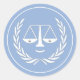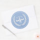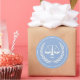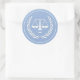 Adesivos de presente de formatura criativos para a faculdade de direito, rótulos de festa ou selos de envelope com balança da justiça cartoon em fundo azul claro para graduado em direito, advogado, procurador, juiz ou assistente jurídico. Adicione texto para personalizar.