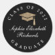 Este adesivo clássico elegante de graduação de na moda apresenta um simples design preto e branco com boné de formatura dourado e texto personalizável. Elementos de coordenação disponíveis na Coleção de Graduação de Script Clássico por Stacey Meacham. Clique no botão editar para personalizar este design.
