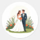 Inclui 20 pequenos adesivos numa única folha. Um adesivo elegante com noiva e noivo cercado por flores vibrantes, perfeito para comemorações de casamento e presentes românticos.